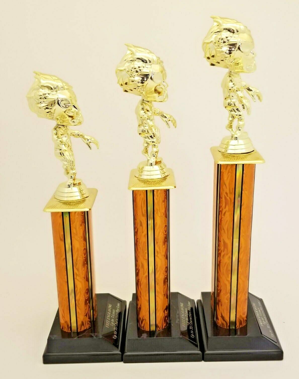 HALLOWEEN ZOMBIE SET OF (3) TROPHIES (1) 12", (1) 13", (1) 14".  EACH TROPHY INCLUDES ZOMBIE FIGURE, WIDE ORANGE COLUMN AND BLACK BASE WITH PLATE THAT WE WILL ENGRAVE FOR FREE.  GREAT 1st, 2nd and 3rd Place AWARDS FOR YOUR HALLOWEEN PARTY OR EVENT